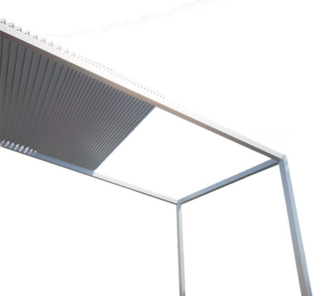 El sistema Space es un techo móvil de paneles diseñado para zonas exteriores que necesitan sombra, protección contra la lluvia, ventilación natural y resistencia al viento.