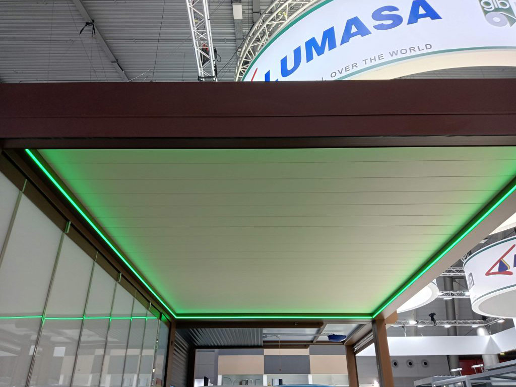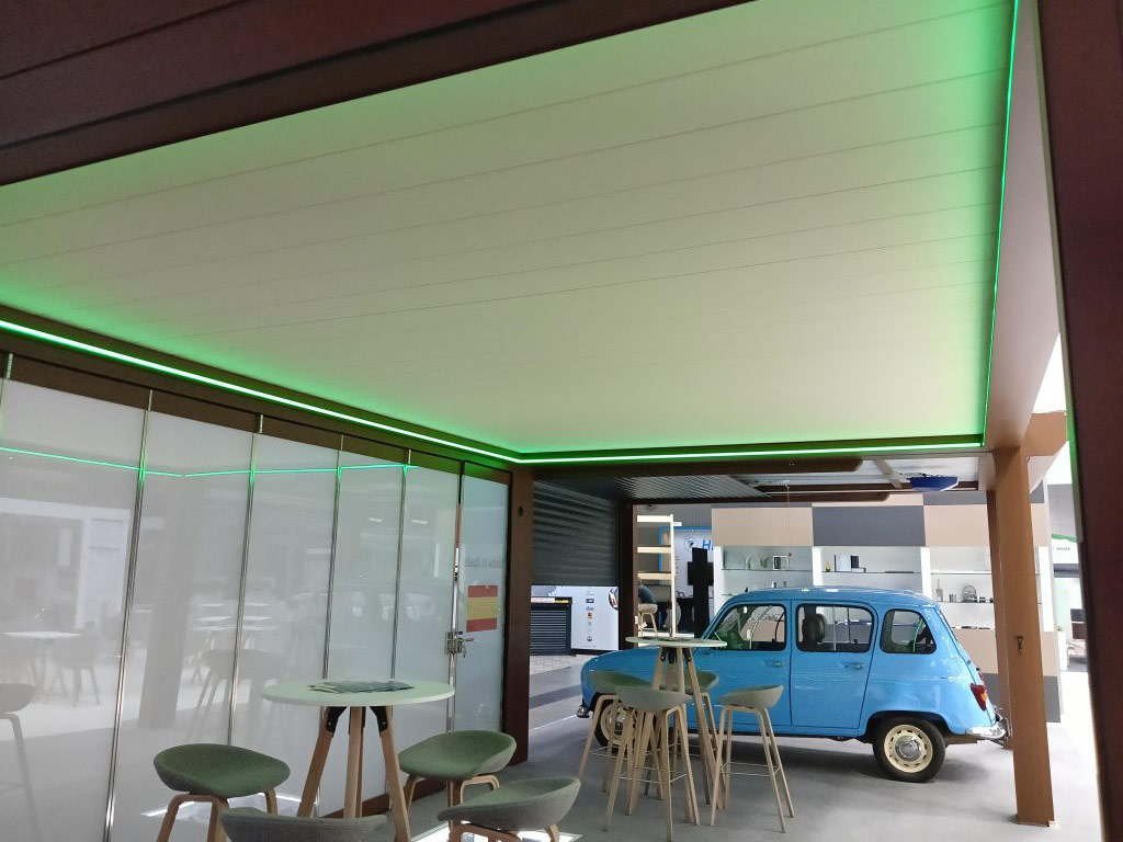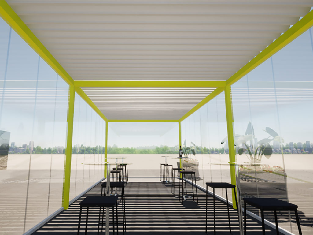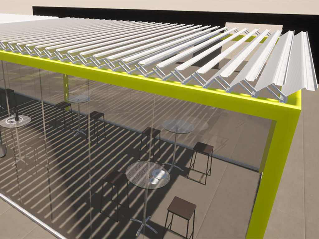 Gracias a su estructura de aluminio reforzado y paneles móviles, Space permite abrir o cerrar la cubierta según el clima, manteniendo un espacio confortable durante todo el año.